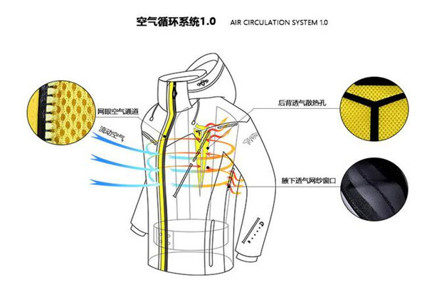 空氣循環(huán)系統(tǒng)1.0:可調(diào)節(jié)雙門襟設(shè)計,在滑雪時根據(jù)情況自由切換 寒冷天氣下需要保留體內(nèi)熱量時,閉合第一道拉鏈 在劇烈運動大量出汗時,使用空氣循環(huán)拉鏈,空氣從過濾網(wǎng)眼中進入衣內(nèi),空氣開始循環(huán),排出體內(nèi)多余熱量;通過腋下透氣窗口將衣內(nèi)多余的熱量排出體外。 如下圖所示: