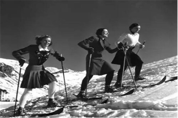 20世紀(jì)30年代開始,滑雪服裝開始融入時(shí)尚元素也更加具有設(shè)計(jì)感。用來滑雪的服裝增加了收身剪裁的上衣,褲子也以闊腿褲為主。以下呢是當(dāng)時(shí)這個(gè)階段幾位女性穿的衣服搭配短裙。