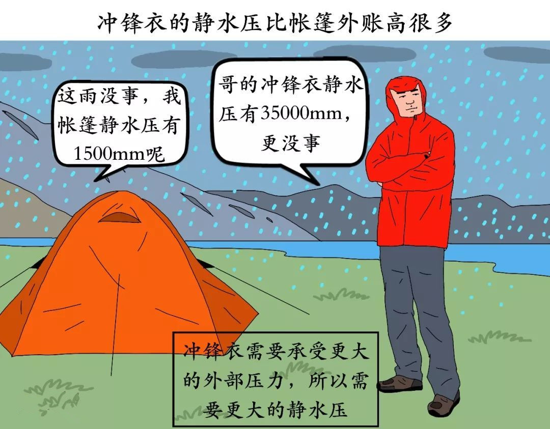 如果你仔細(xì)觀察帳篷的參數(shù),會(huì)發(fā)現(xiàn)它們只有1200~5500mm的靜水壓值即可抵御雨水侵襲,而沖鋒衣則需要13000mm以上的靜水壓,這背后的原因就在于兩者所承受的外部壓力不同。