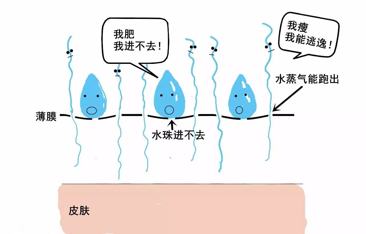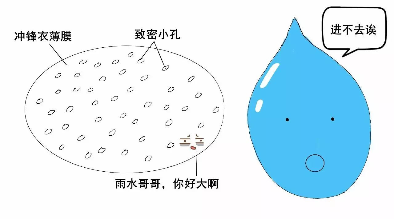 2)沖鋒衣的薄膜的孔很小,比雨滴小很多,所以雨滴進不去小孔。