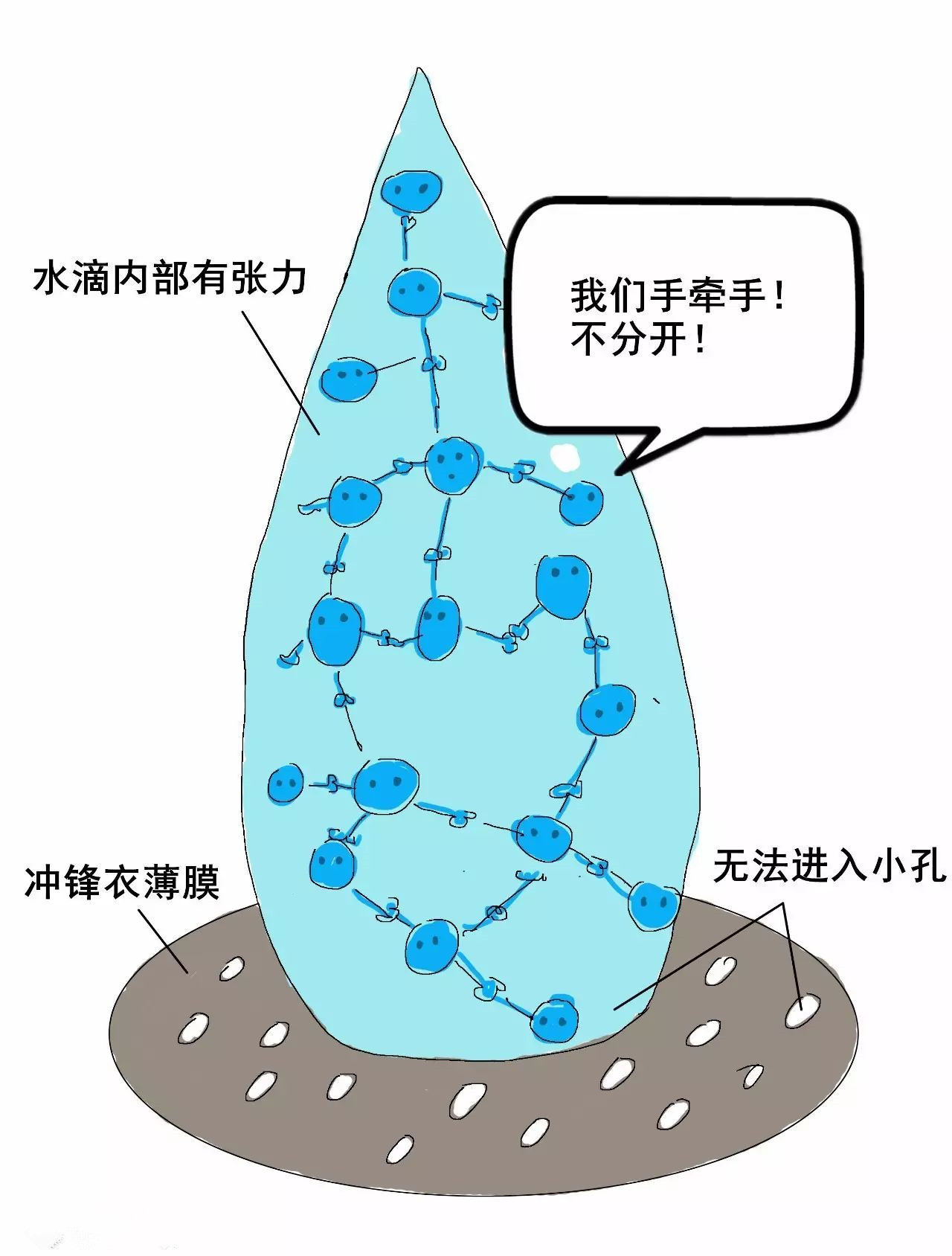 1)水滴內(nèi)部的張力讓它無法進入薄膜。因為雨滴的“張力”很強,水分子之間強烈吸引,就像抱團在一起。當雨滴接觸薄膜時,沒有水分子愿意離開水滴。