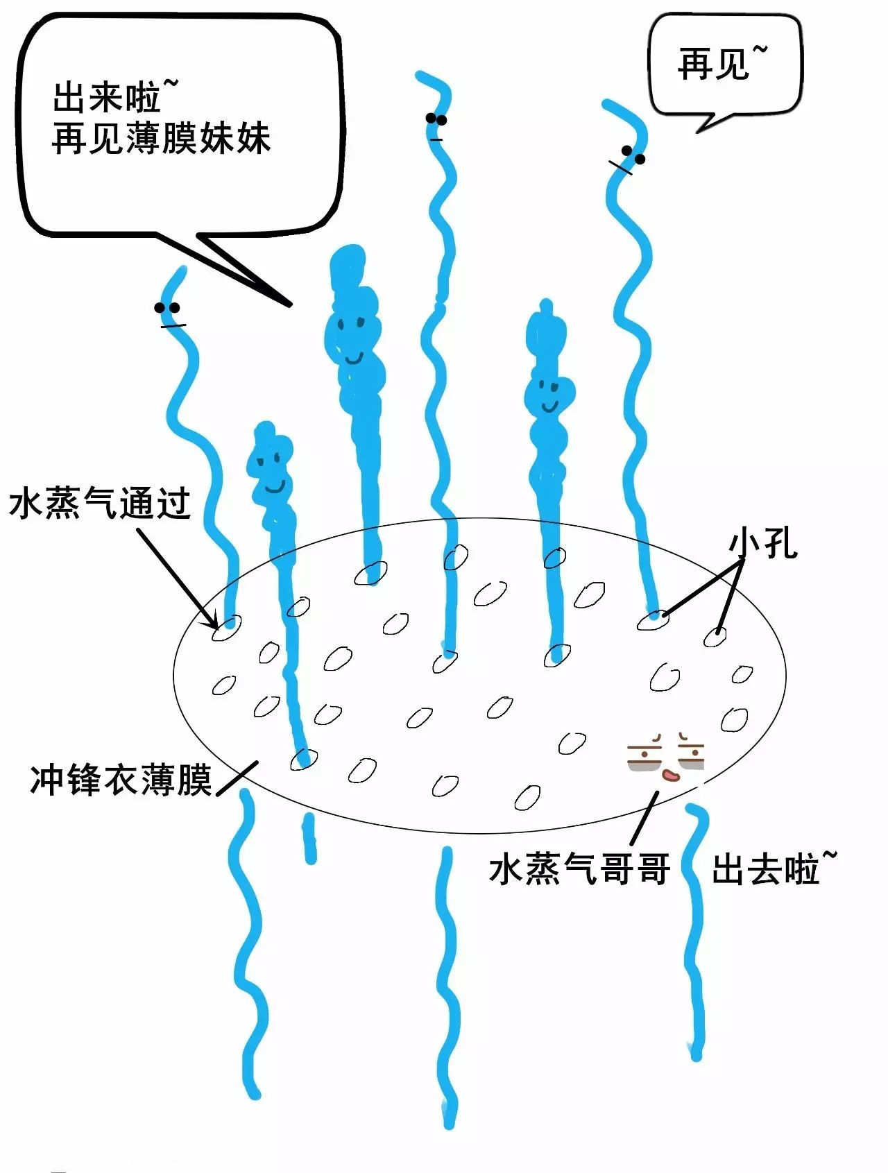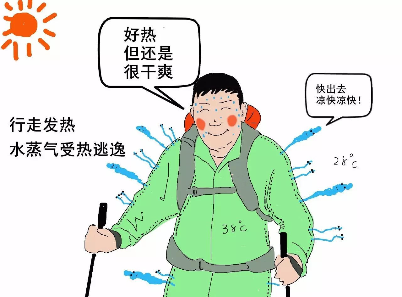 2)因為水蒸氣比水珠小很多,水蒸氣很細小,可以鉆過沖鋒衣薄膜的小孔排出。