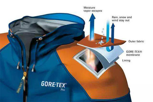 (1)一種是EPTFE復(fù)膜的微孔型面料,目前國內(nèi)多是GORE-TEX、DENTIK、EVENT、3TO1-TEX這幾種。它防水透氣的功能是在服裝的外面料上復(fù)合一層微孔薄膜,其中的微孔比水滴分子小,又比氣體分子大,可以在阻擋雨水的同時(shí)揮發(fā)自身的汗氣。