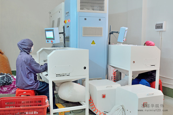 第一步:先用風(fēng)機(jī)把羽絨吸入儲絨箱,使得室內(nèi)環(huán)境衛(wèi)生,不再有飛絨,確保生產(chǎn)現(xiàn)場環(huán)境的整潔、干凈,也節(jié)省原料。