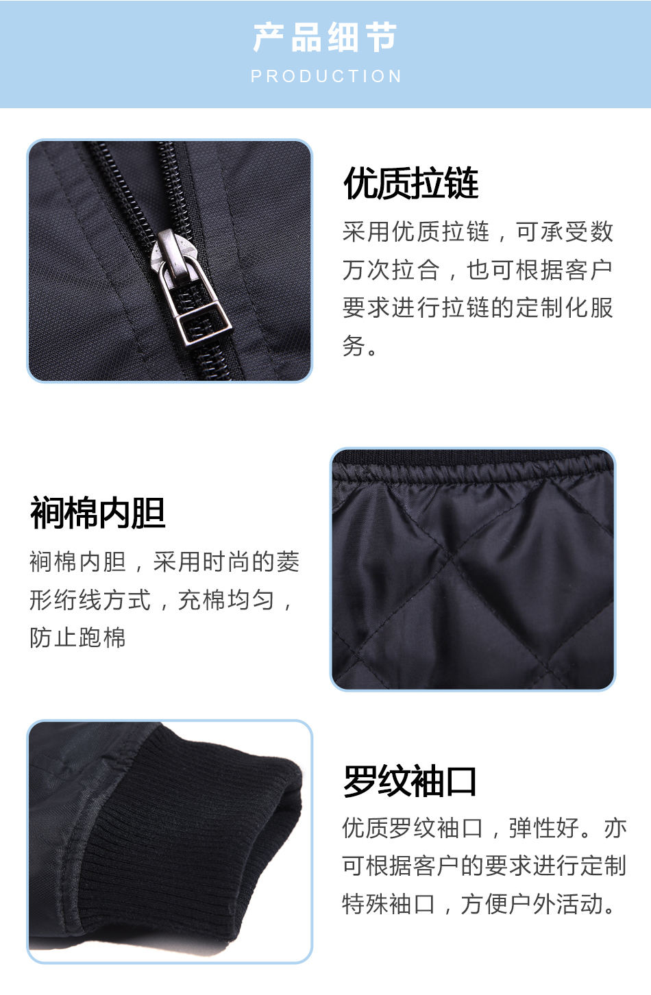 羅紋袖口:優(yōu)質(zhì)羅紋袖口,彈性好。亦可根據(jù)客戶的要求進(jìn)行團(tuán)體夾克定制其特殊袖口,方便戶外活動(dòng)。