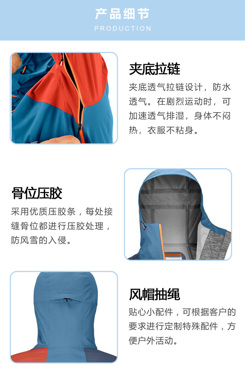 風帽抽繩:貼心小配件,可根據(jù)客戶的要求進行定制特殊配件,方便戶外活動。