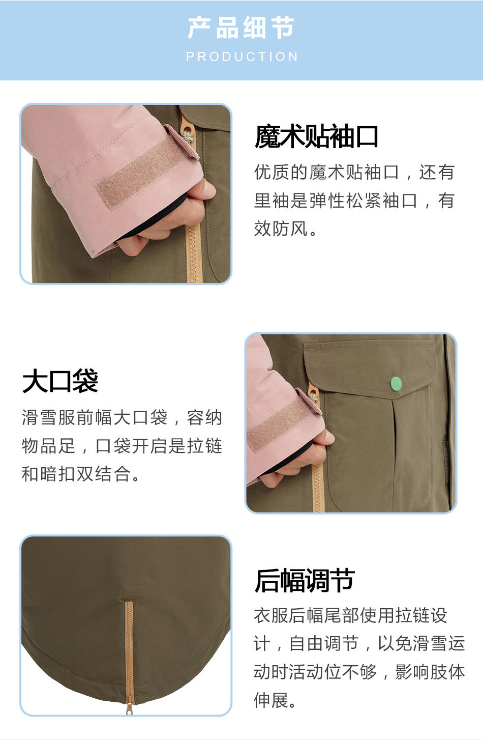 大口袋:滑雪服前幅大口袋,容納物品足,口袋開啟是拉鏈和暗扣雙結(jié)合。