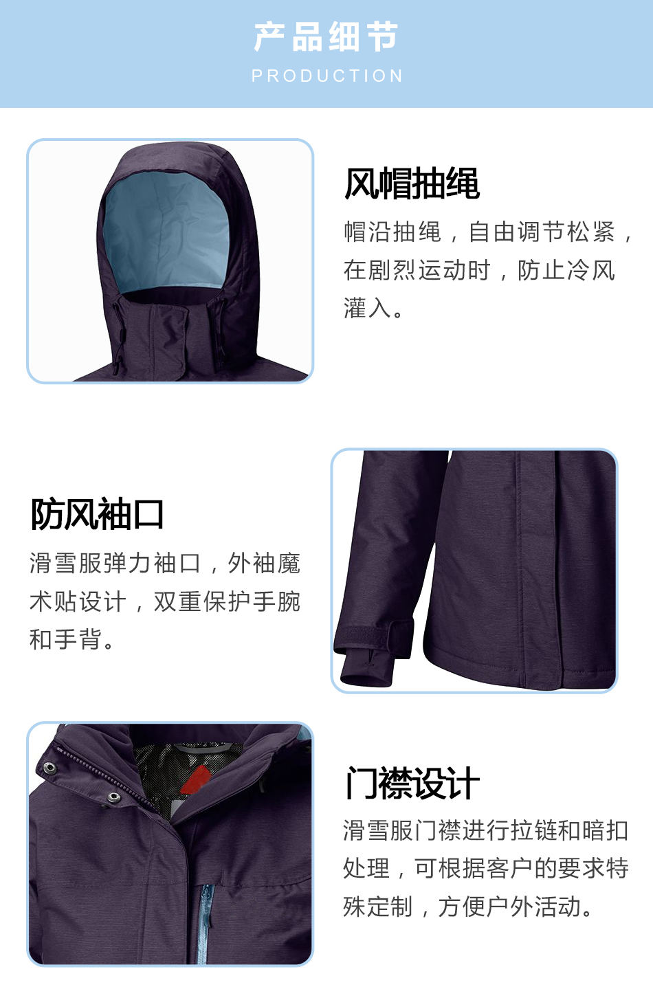 門襟處理:滑雪服生產(chǎn)的門襟進(jìn)行拉鏈和暗扣處理,可根據(jù)客戶的要求特殊定制,方便戶外活動。