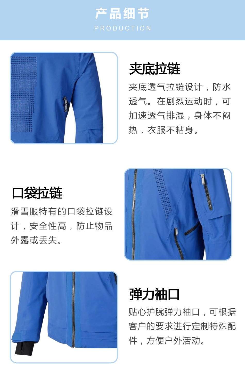 彈力袖口:貼心護腕彈力袖口,可根據(jù)客戶的要求進行定制特殊配件,方便戶外活動。