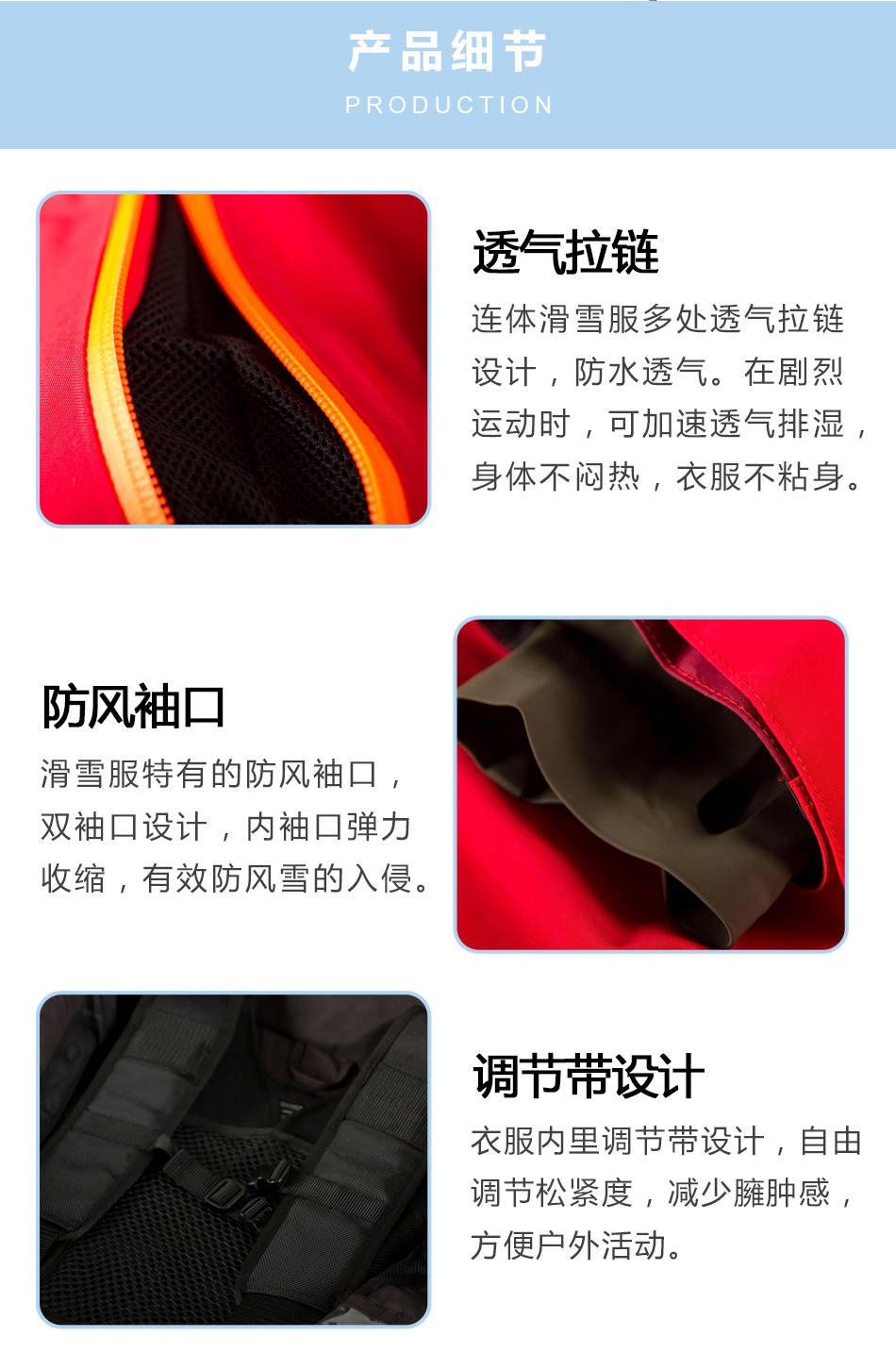 透氣拉鏈:連體滑雪服定制內(nèi)多處透氣拉鏈設(shè)計(jì),防水透氣。在劇烈運(yùn)動(dòng)時(shí),可加速透氣排濕,身體不悶熱,衣服不粘身。